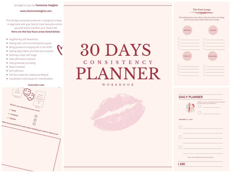 This 30 Days Consistency Planner is designed to keep you in alignment with your best and most favourite version of yourself and to manifest your dream life!